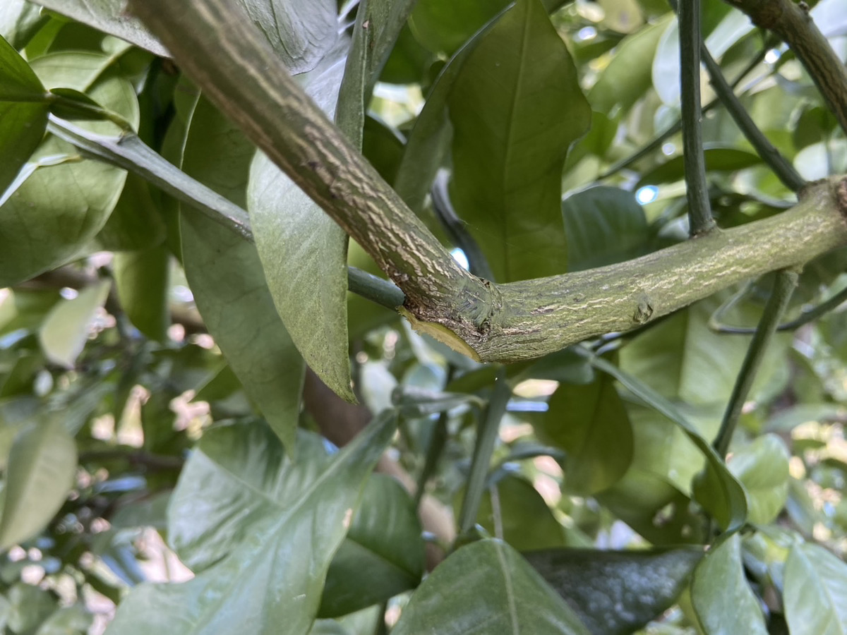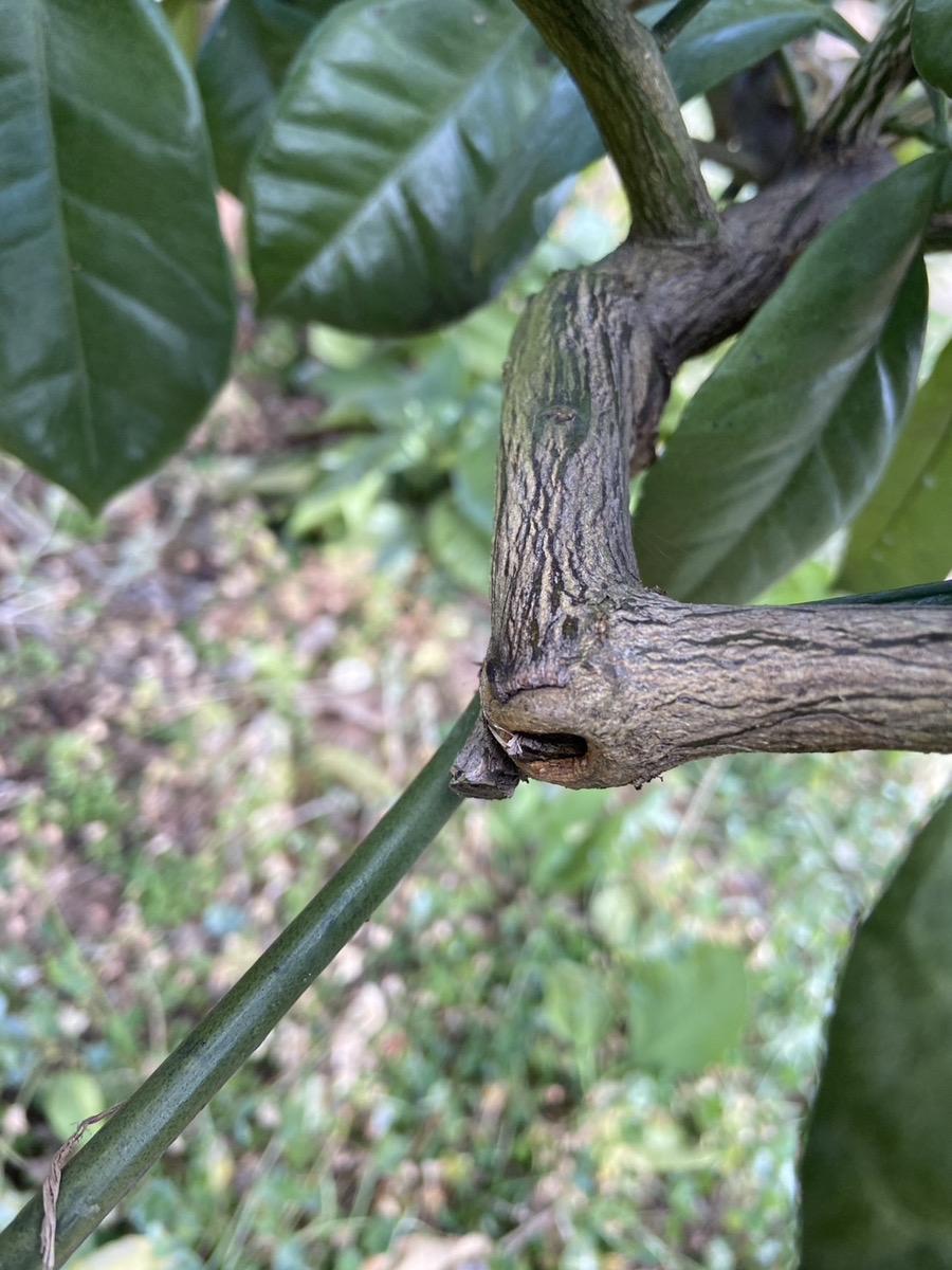 途中切りしなければ、綺麗に傷口が治る(癒合する) 癒合部分のすぐ下では、途中切りから枯れ込み