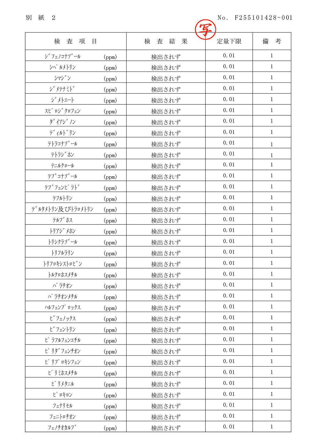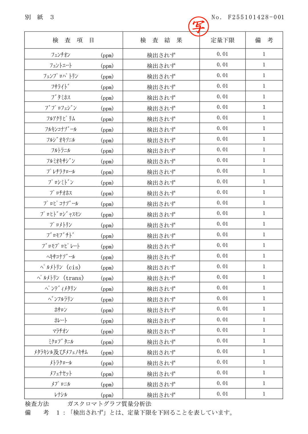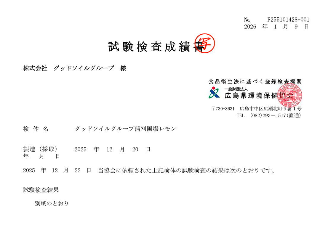 グッドソイルグループ直営圃場蒲刈レモンは、食品衛生法に基づく登録検査機関である一般財団法人広島県環境保健協会の100項目の残留農薬検査で、昨年に続き全ての項目において、残留農薬は検出されておりません。